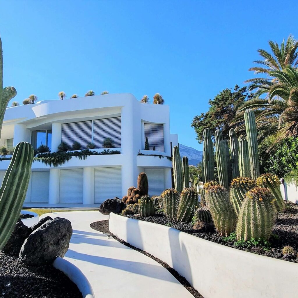 Transforming home exteriors with sustainable, low-maintenance designs using cacti and palms for a stunning desert aesthetic.