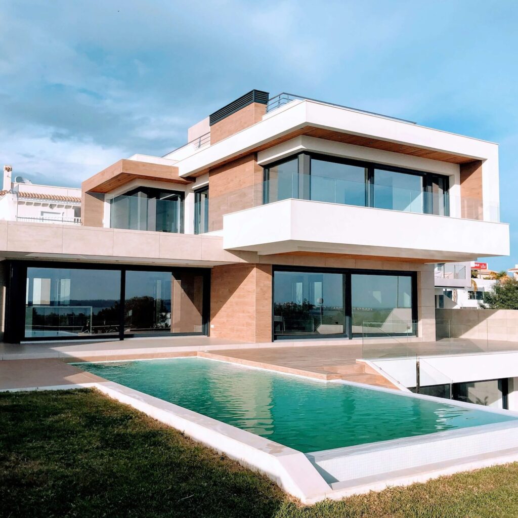 A sleek, contemporary home featuring clean lines, expansive windows, and an elegant pool to embody modern luxury.